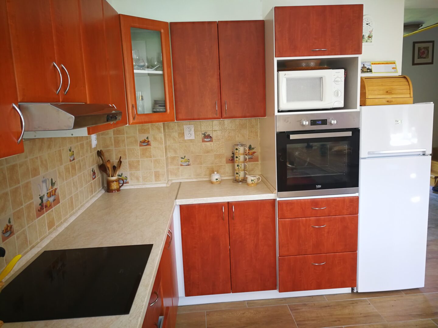 V přízemí se nachází společná místnost, kde se setkávají kuchyň, jídelní kout a obývací část. Moderně vybavená kuchyň nabízí lednici, varnou desku, troubu, mikrovlnku, myčku nádobí, rychlovarnou konvici a veškeré potřebné nádobí.