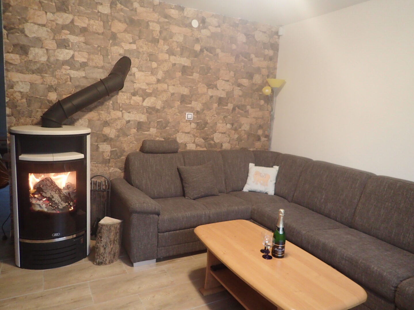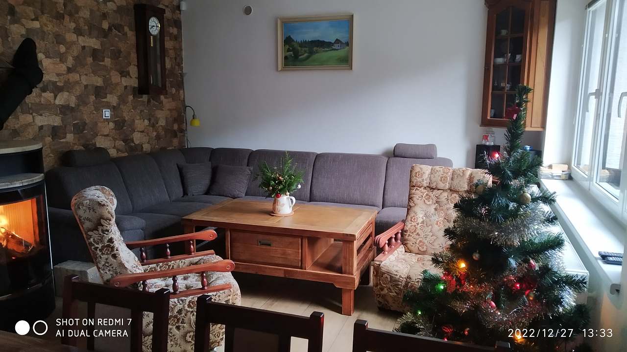 Na kuchyň navazuje jídelní kout, následuje obývací pokoj s krbem, televizí, rádiem, pohodlnou sedací soupravou, křesly a hračkami pro děti.